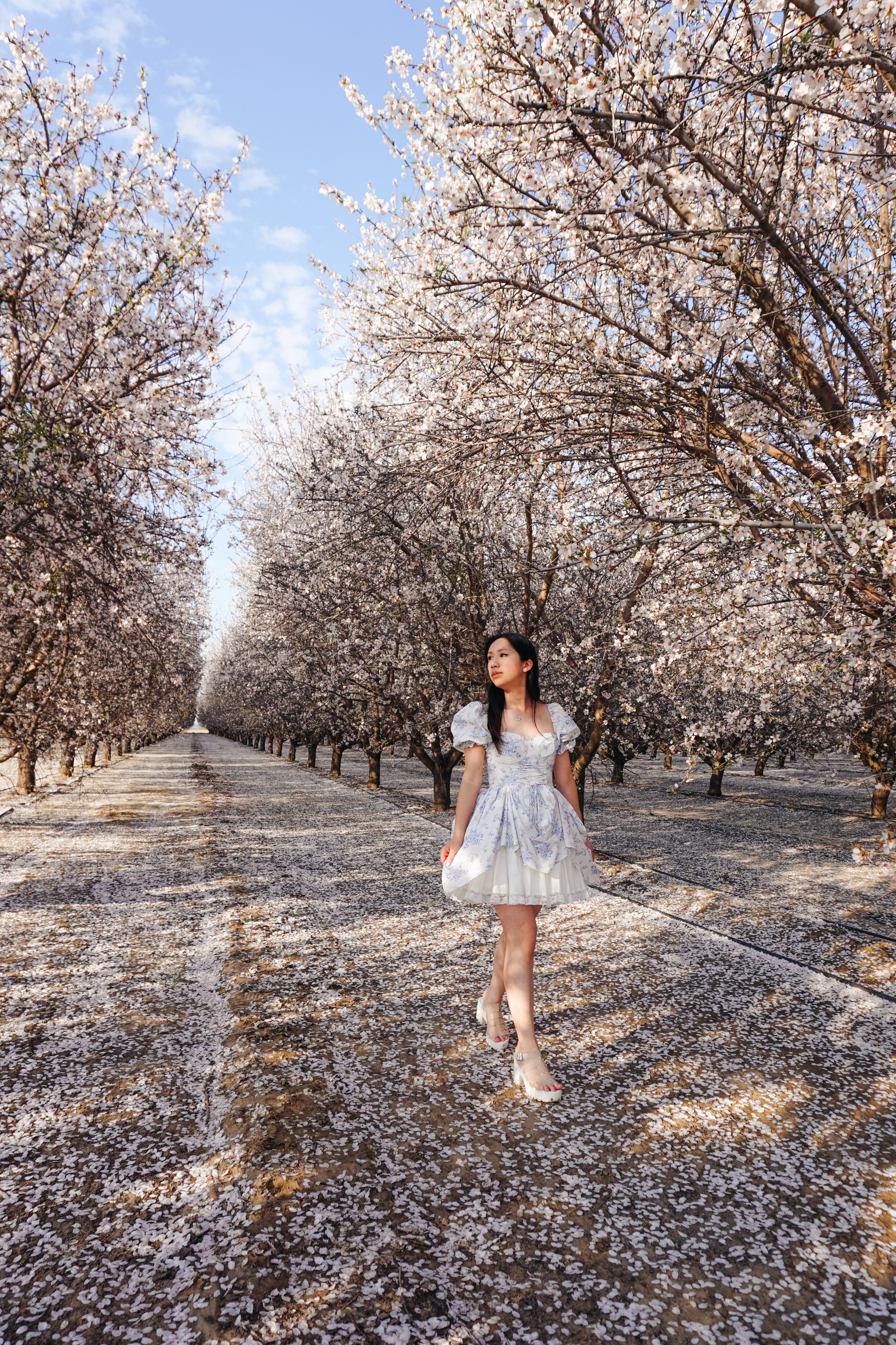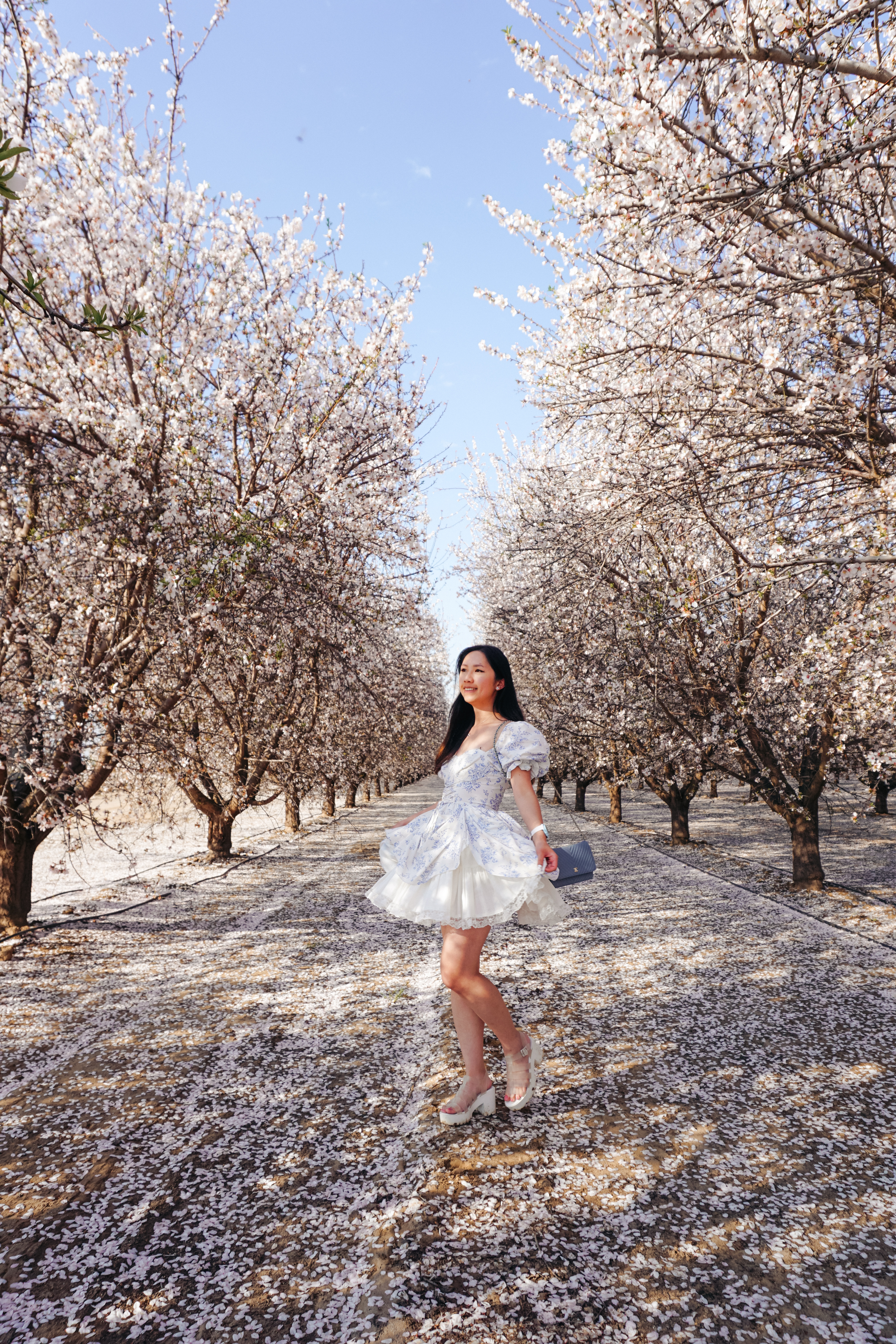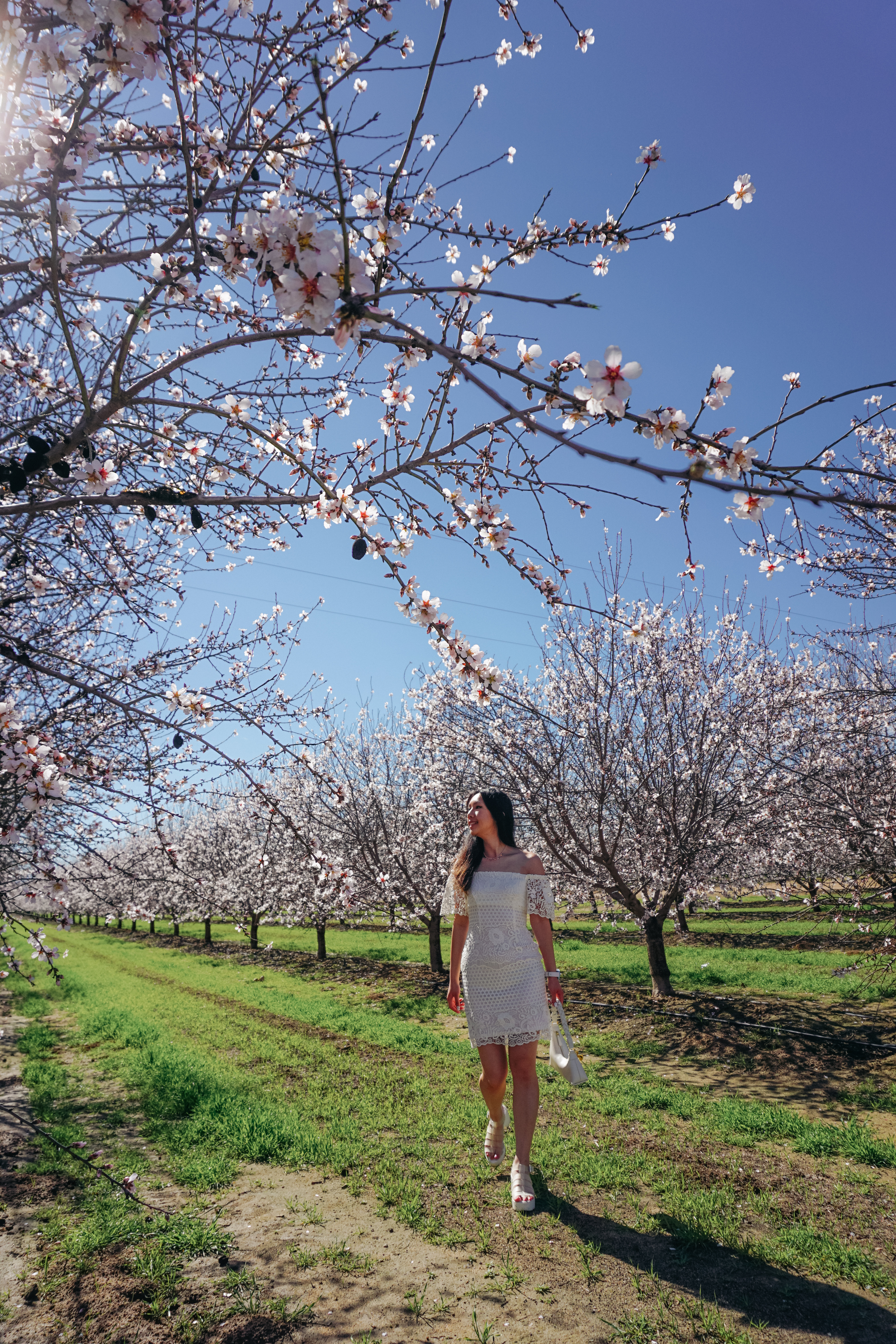 Almond blossoms hit their peak bloom around late February, start to wilt around early March, and will be gone by mid March. At this time of writing, you should visit them right now!