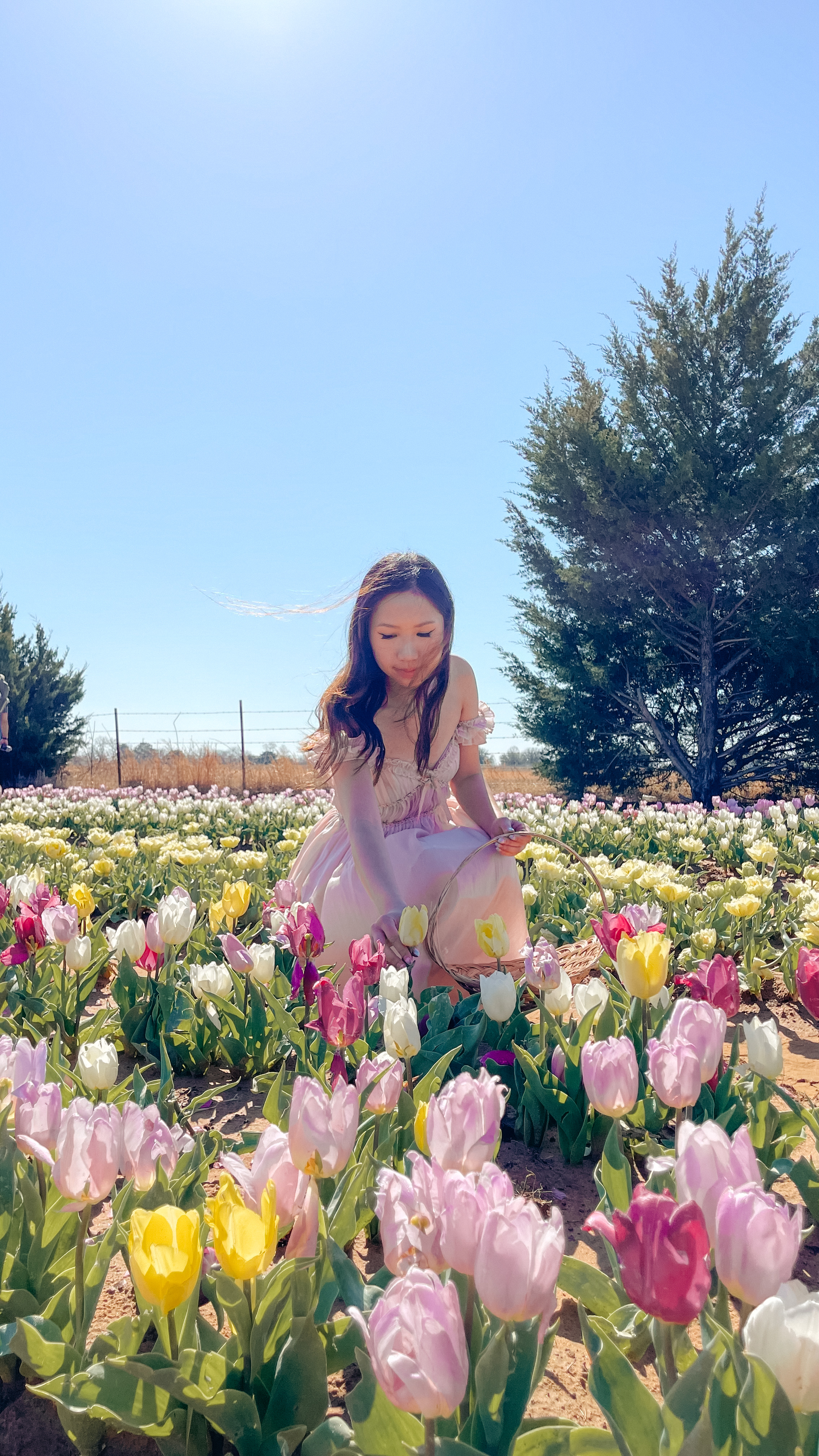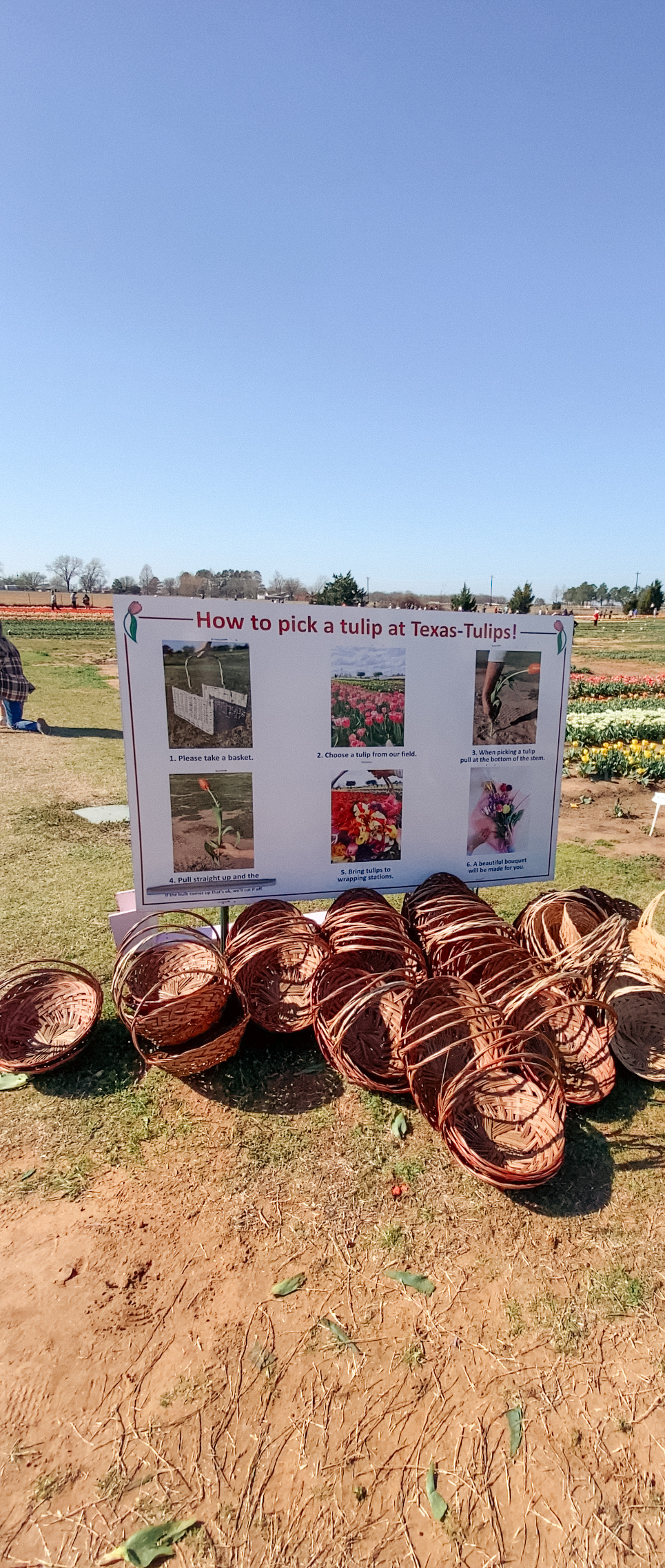 At Texas-Tulips, you will see a pile of baskets near the entrance that you can use to carry any tulip stems you pick. As you wander throughout the fields, enjoy the view and look out for any flowers you may be interested in adding to your bouquet. Once you find a flower you like, grab the stem near the base and pull straight up. Then, place the flower into your basket and continue on! The only limit to how many tulips can you pick is your own desire and budget!